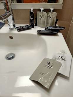ZimmerDas Hotel stellt Shampoo und Co. zur Verfügung. Leider in Plastikbeuteln statt in wieder auffüllbaren Spendern.