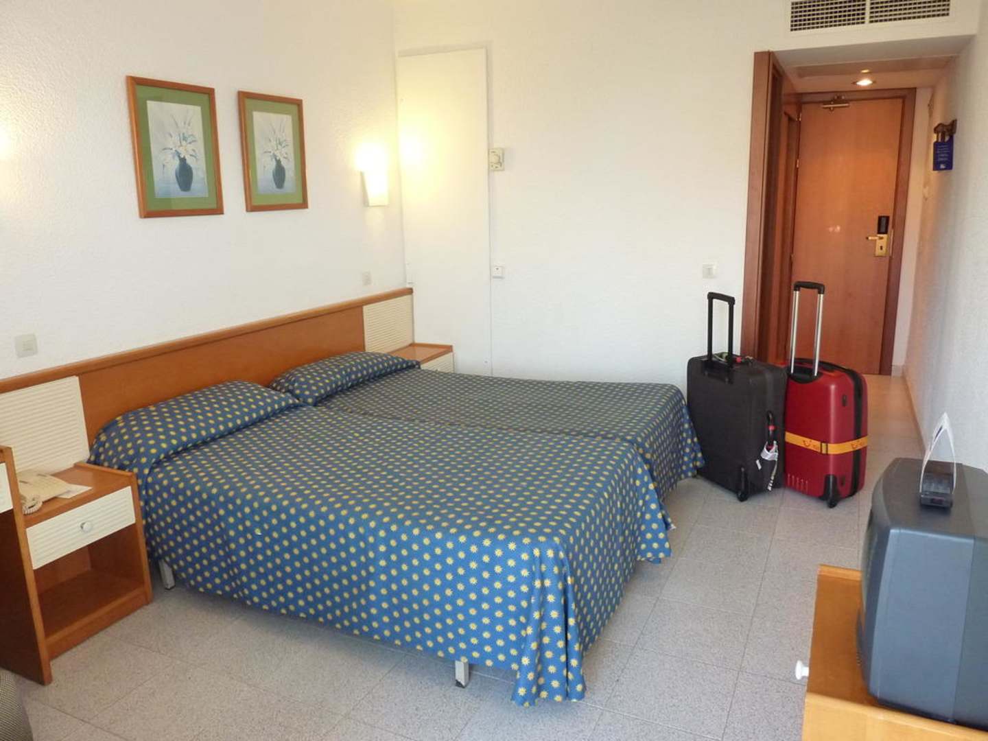 Das Doppelbett besteht aus 2 einzelnen Betten. In dem Zimmer befindet sich noch eine Kommode mit Spiegel, 2 Nachttischschränkchen und der Fernseher. Gleich neben der Tür geh es ins Minibad.
