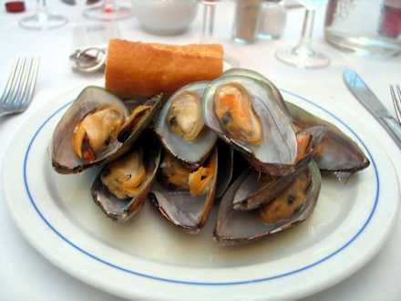 Miesmuscheln mit Baguette (Nahaufnahme)