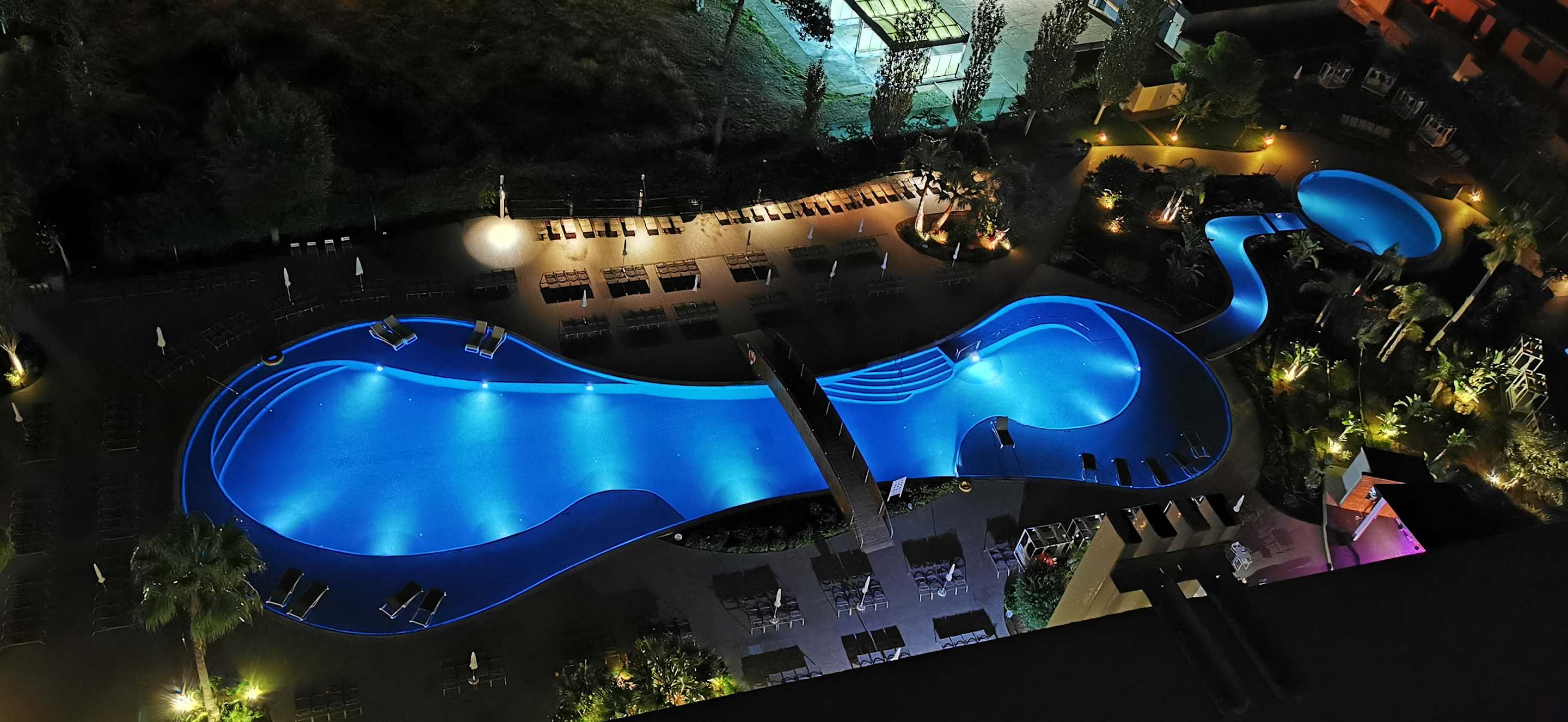 Unsere Pool Anlagen Ansicht , Abends von der Sky Bar auf dem Dach