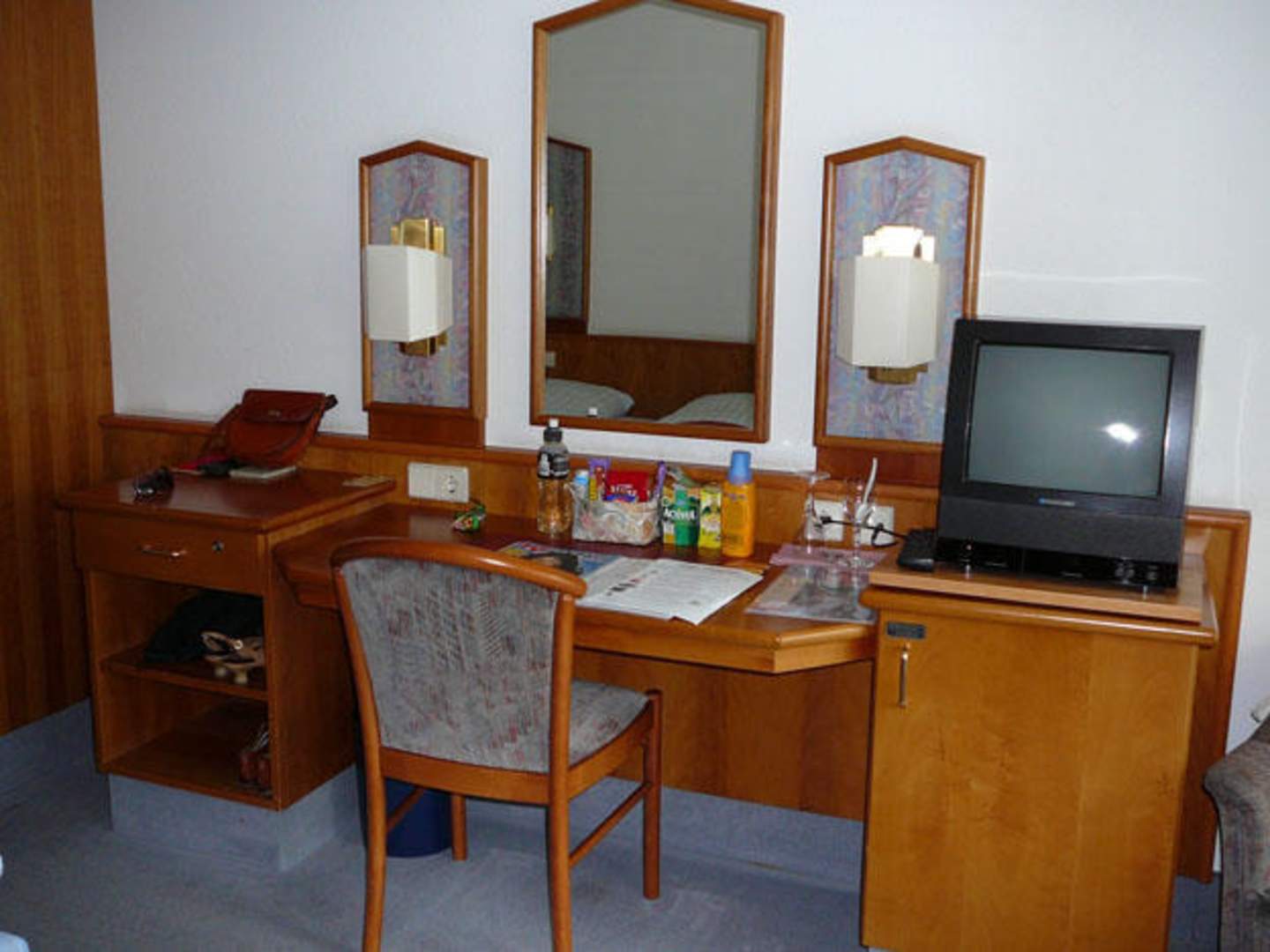 Schreibtisch, Fernsehkonsole, Spiegel.