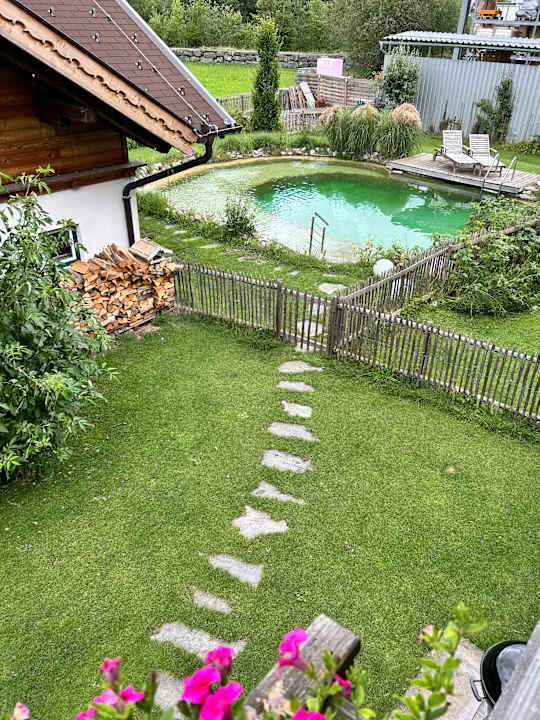 Blick auf Naturbadeteich vom Balkon