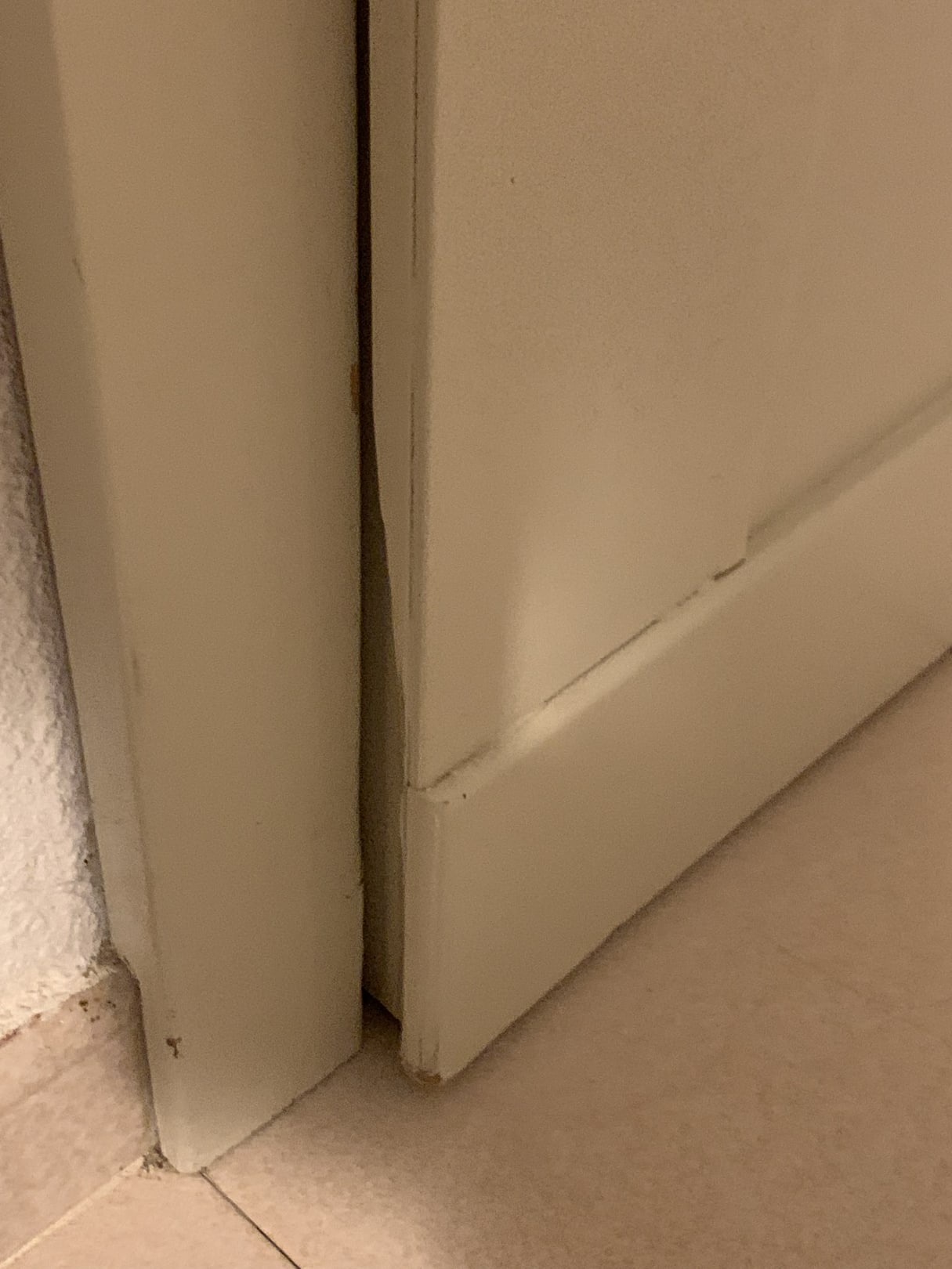Zimmereingangstür mit sehr großem Spalt und ausgebrochenem Holz, Türe schließt nicht richtig
