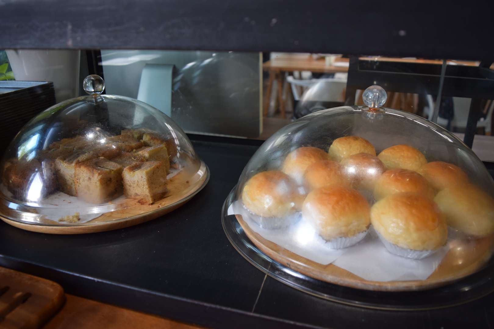 Frühstück in Buffet-Form (Teilansicht), Bananen-Kuchen und JFrühstück in Buffet-Form (Teilansicht), Bananen-Kuchen und Japanische Brötchen