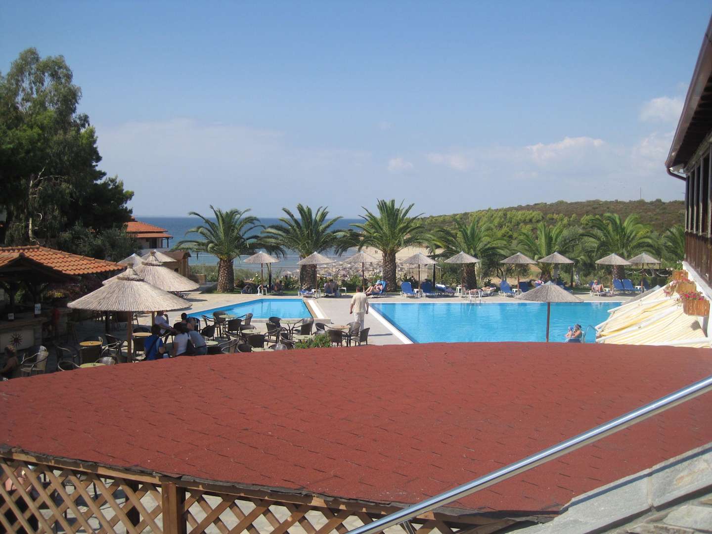 Blick zum Pool/Meer vom Hauptgebäude aus