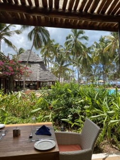Blick vom Büffetrestaurant zum Pool