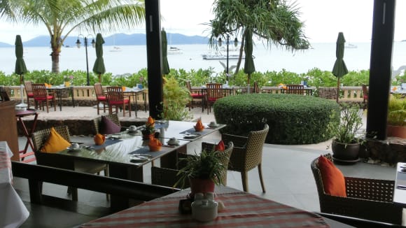 Ausblick vom restaurant über das Meer. Im Hintergrund die Nachbarinsel Ko Pha-ngan