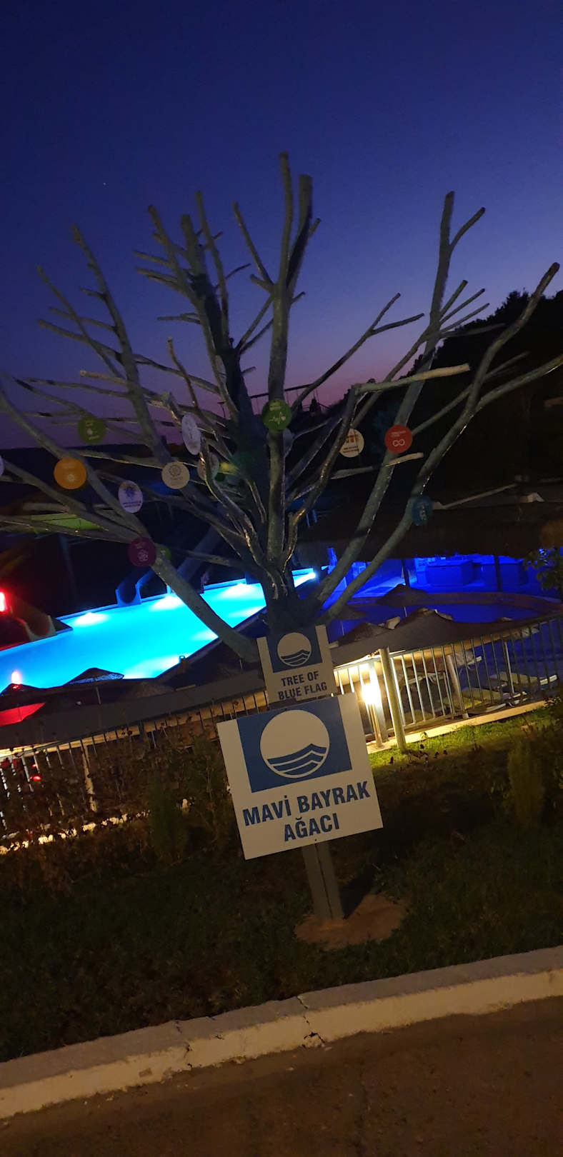 Dieser Baum trägt alles Auszeichnungen was das hotel bekommen hat. Das hotel hat eine Auszeichnung für das sauberste und schönste Meer: Mavi bayrak.