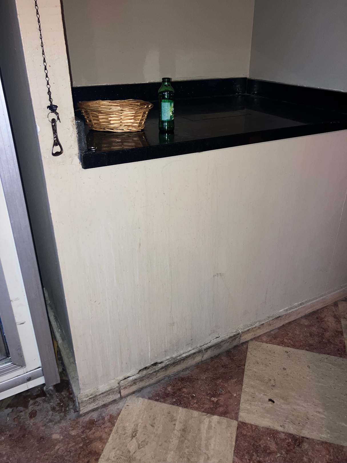 Getränkespuren haben die Wand mitsamt dem Boden beschädigt, Schimmelansatz