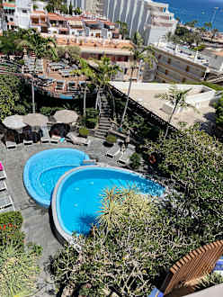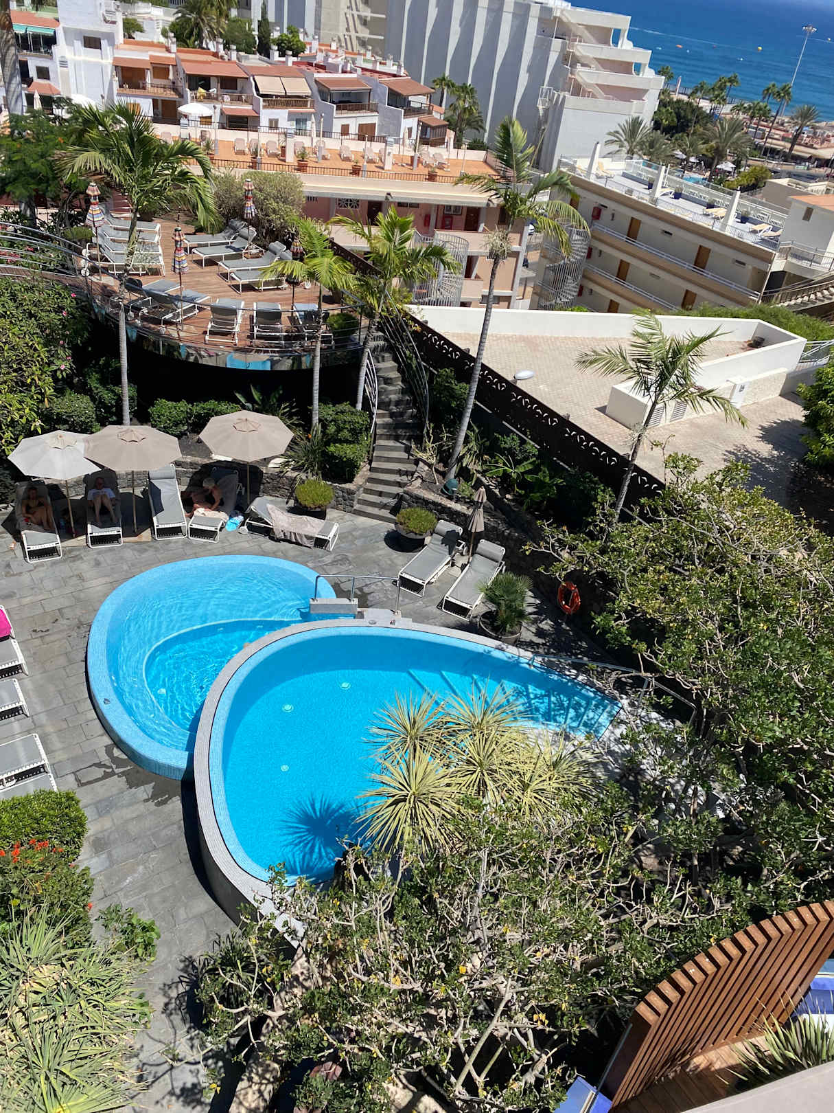 PoolAusblick vom Zimmer auf den einen Bereich des Pools mit Whirlpool. Es gibt einen zweiten Bereich auf der anderen Seite