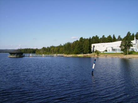 am Pielinen-See, Bomba Spa Hotel, FinnlandNur 200 Meter vom karelischen Bomba-Haus entfernt liegt das Haupthaus direkt am Ufer des Pielinen-Sees im Ostteil Finnlands. In dem abgebildeten Neubau befindet sich die Rezeption, 17 Zimmer und der große Spa-Bereich (Sauna, Hallenbad). Links im Bild steht im See eine Sauna. Im alten Bomba-Haus befindet sich das Restaurant und eine Bar, aber keine Zimmer. Im umliegenden Waldgebiet sind etwa 30 einfache Blockhäuser, die vermietet werden (auch tageweise). Die Einrichtungen im Haupthaus stehen allen Gästen zur Verfügung.