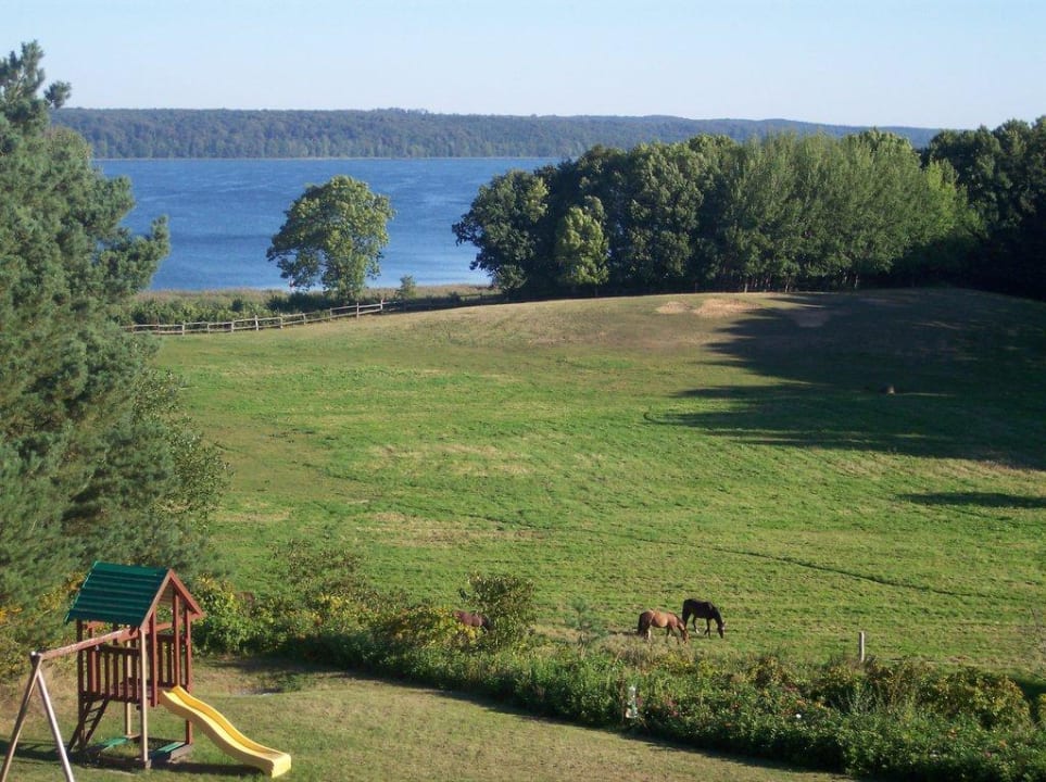 Blick vom Zimmer auf Restaurant und Garten