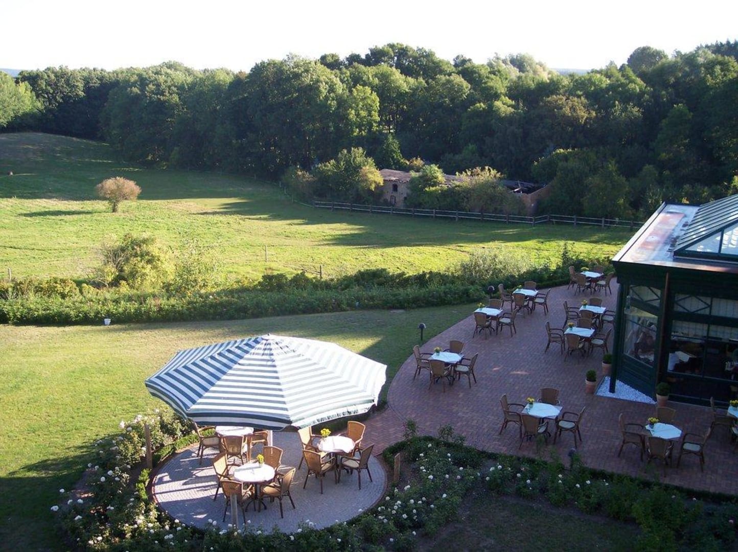 Blick vom Zimmer auf Restaurant und Garten