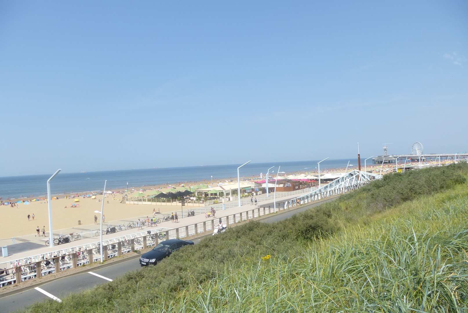 Blick vom Hotel über Straße, Promenade, Strand, Blickrichtung Pier