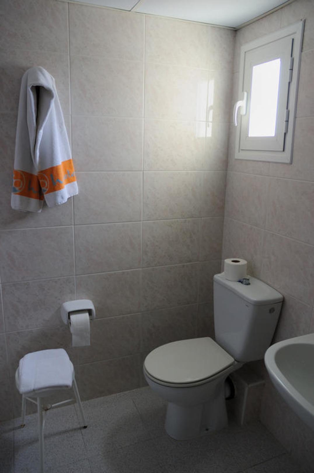 Linke Seite des geräumigen Bades mit Fenster, WC, Handtuchhalter und Hocker