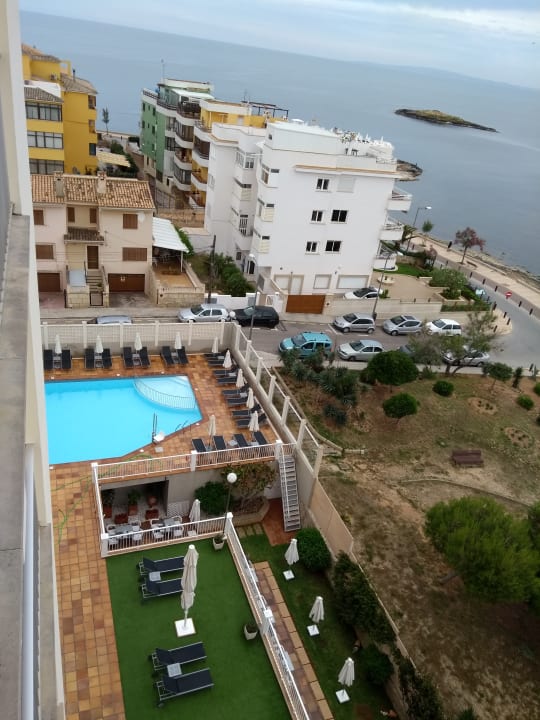 Blick vom Balkon auf einen Teil der Poolterrasse