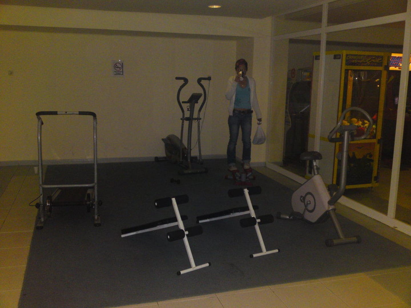 Hier der KOMPLETTE Fitneß-Bereich. Ein Test der Geräte hat es bewiesen: LEBENSGEFAHR. Wobei ich zugeben muß, dass ich auf dem Laufband nicht fähig war zu laufen....