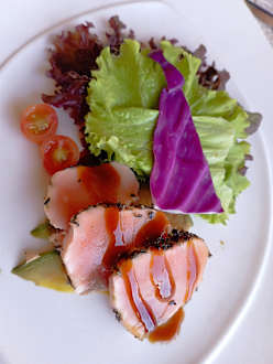 Ein sehr trauriges Lachs Tatiki beim Xhale Mittagessen im Steakhouse. Portion so klein, dass man es mit einer Gabel aufnehmen konnte, Salat trocken ohne Dressing.