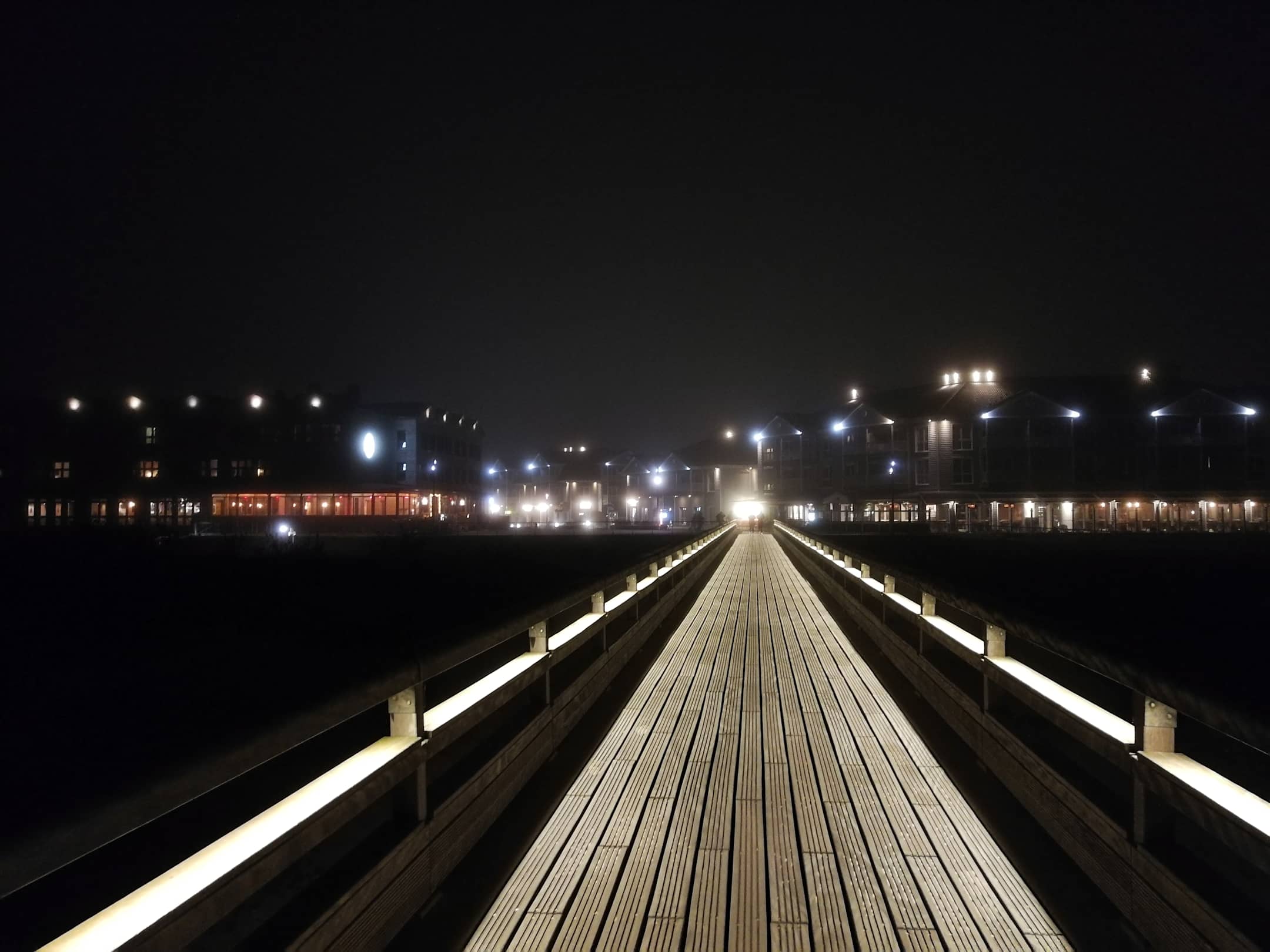 AusblickBlick bei Nacht und leichtem Nebel von der stylischen Mole auf Bretterbude (links) und Beachmotel (rechts)