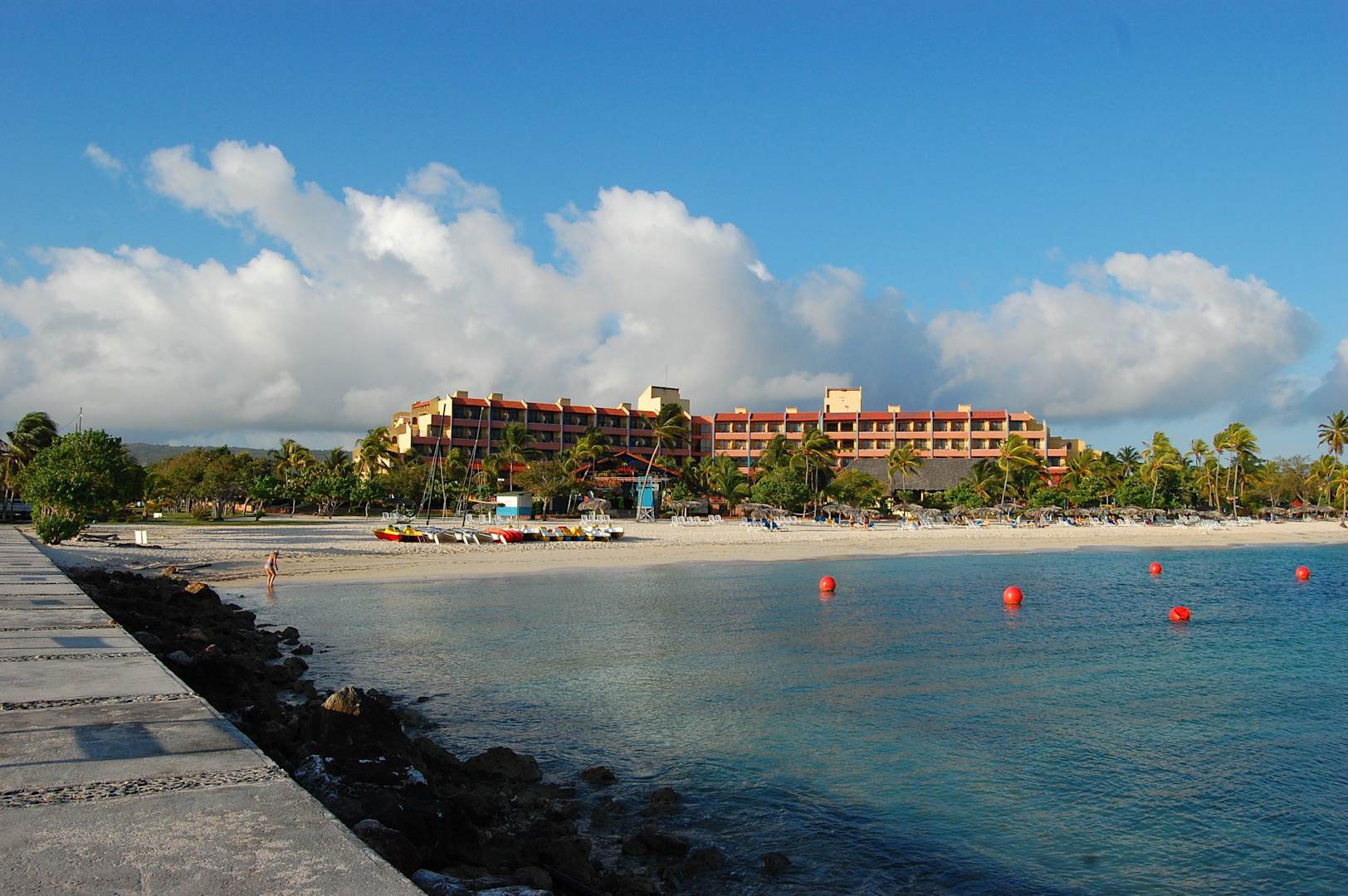 Blick vom Steg am Meer auf das Hotel HauptgebäudeDer Blick auf das Hauptgebäude des Hotels. Es ist eine große Anlage, welche nicht auf ein Bild passt.