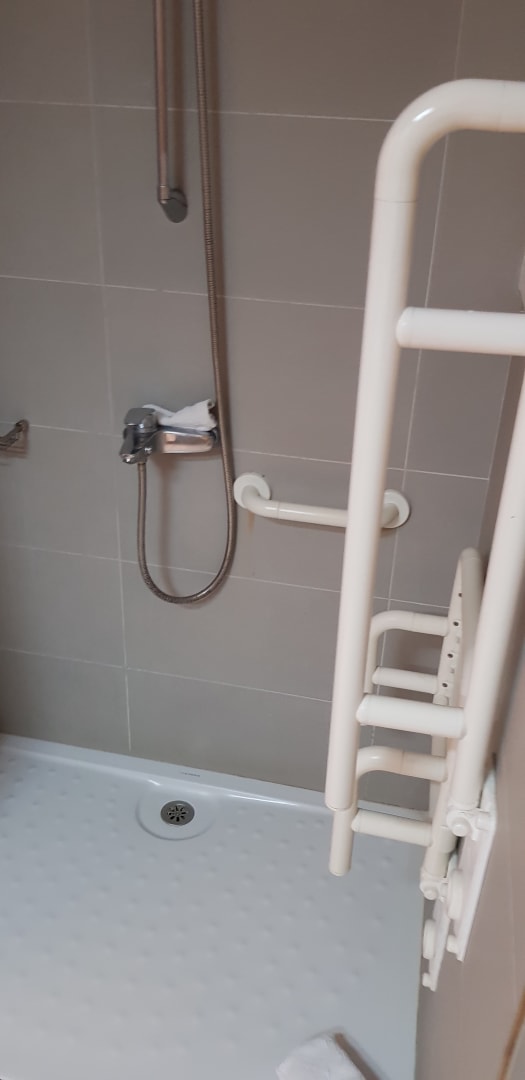 Dusche mit Sitzgelegenheit und allem was man braucht. Super!