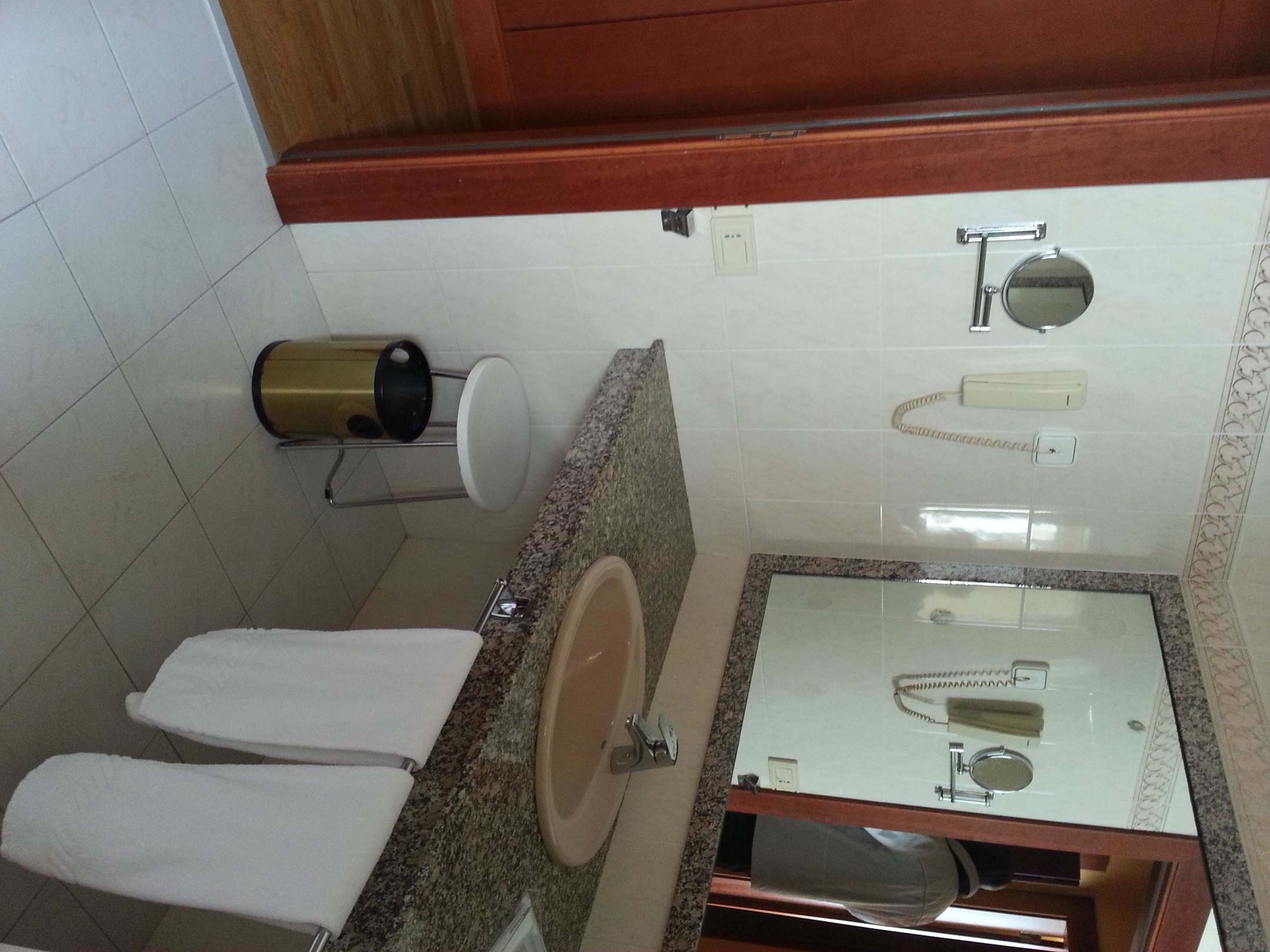 Spiegel, Telefon, Föhn und einen alten Spiegel mit etlichen blinden Stellen.