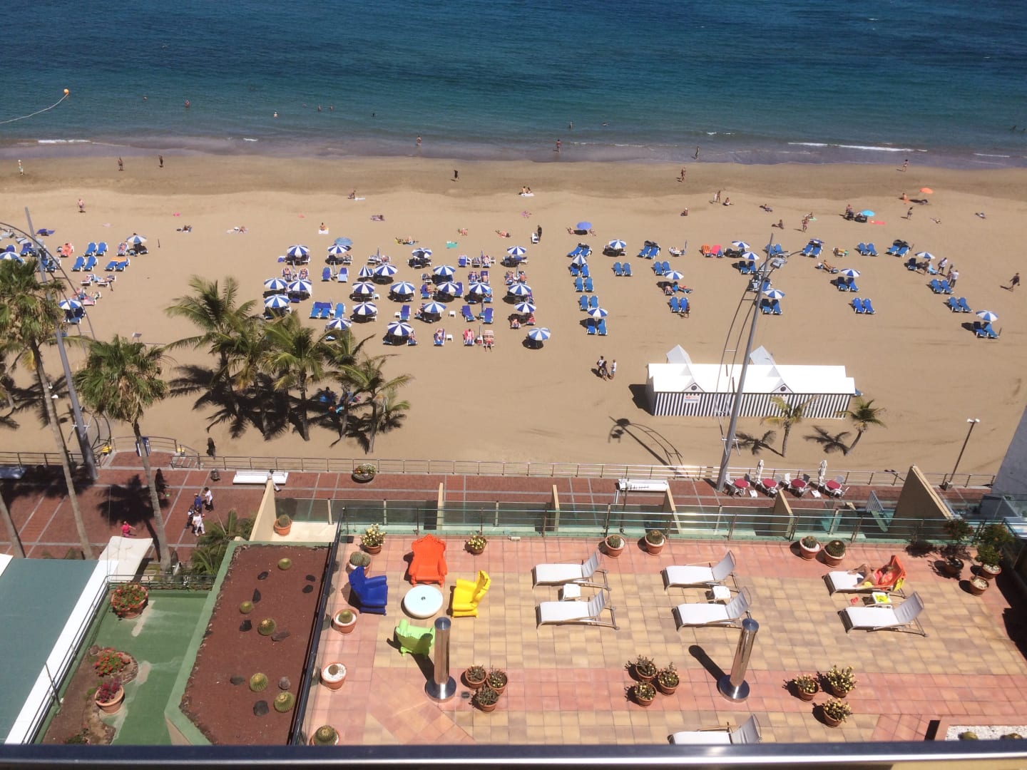 Blick vom Poolbereich auf dem Dach auf Promenade und Strand