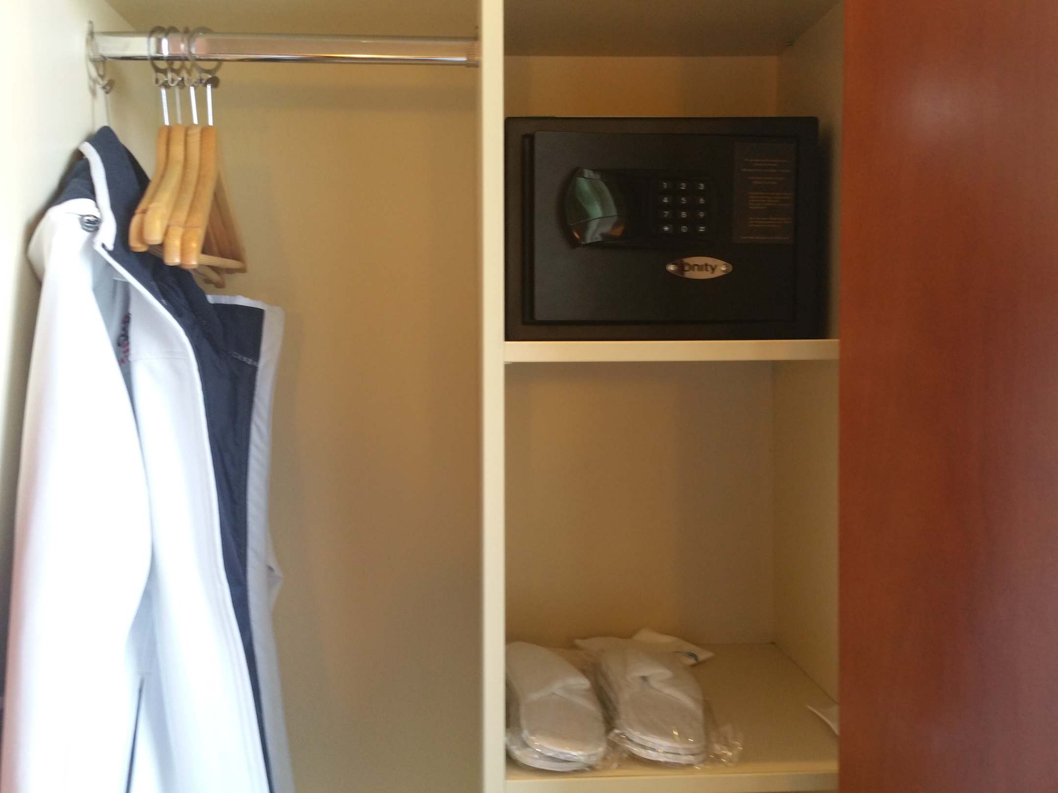 Einer der 2 Schränke mit Tresor und 2 Paar Hausschuhen