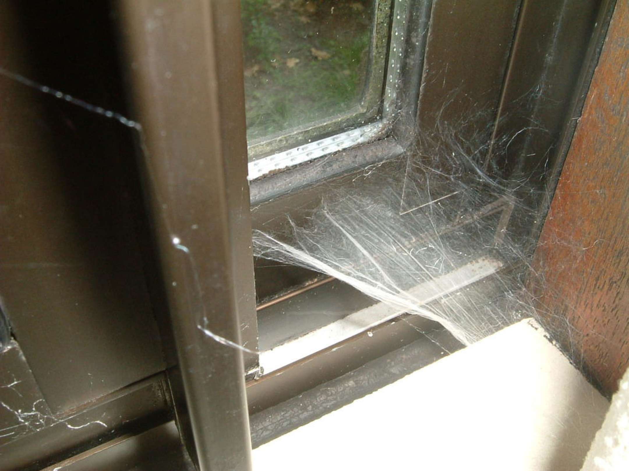 Ekeliges Spinnengewebe innen am Fenster.