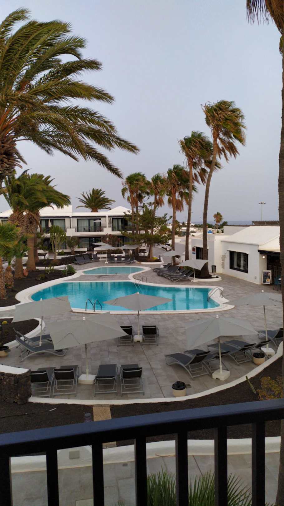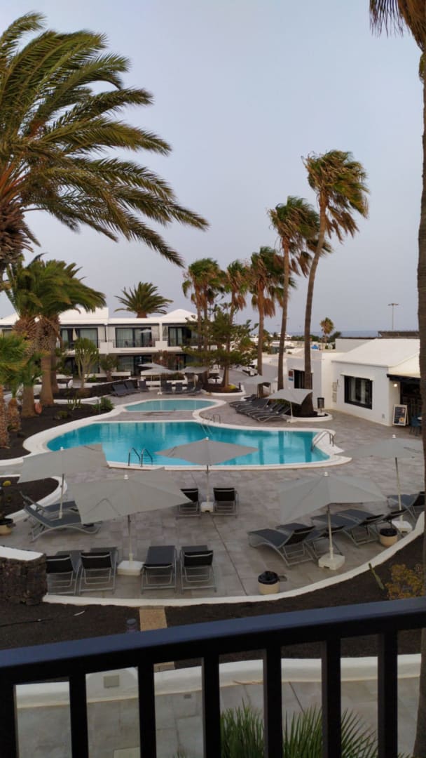 Blick vom Balkon in den Innenhof mit Pool