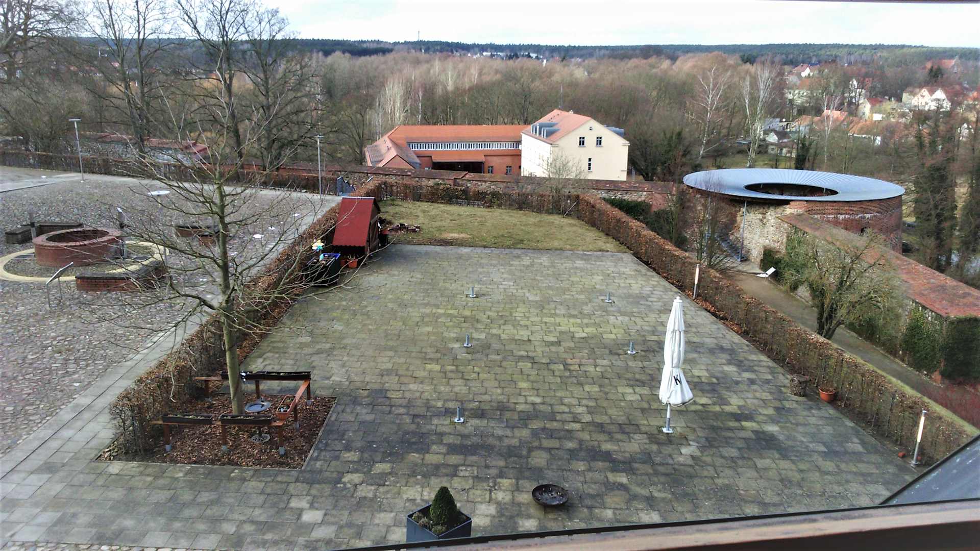 Ausblick geradeaus mit Burgmauer und dem dahinterliegendem P