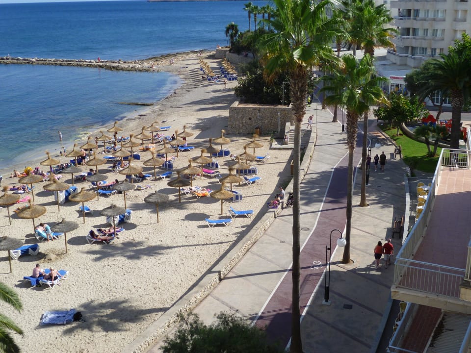 Nochmals Blick auf den Strand mit der Promenade in Richtung Calla Millor. Das Rote ist der Fahrradstreifen. Fahrräder in allen Variationen, Elektroroller u. a. kann an allen Ecken gemietet werden.