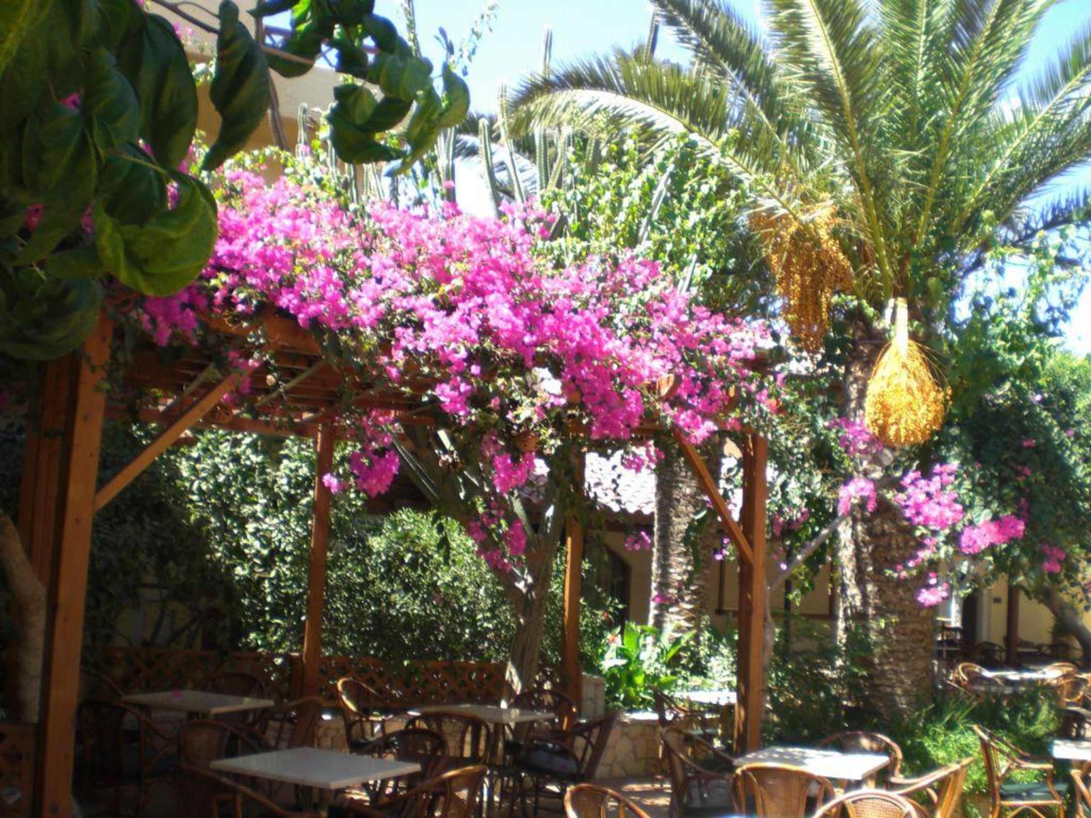 Gemütliches Sitzen unter Blumen und Palmen ist herrlich!
