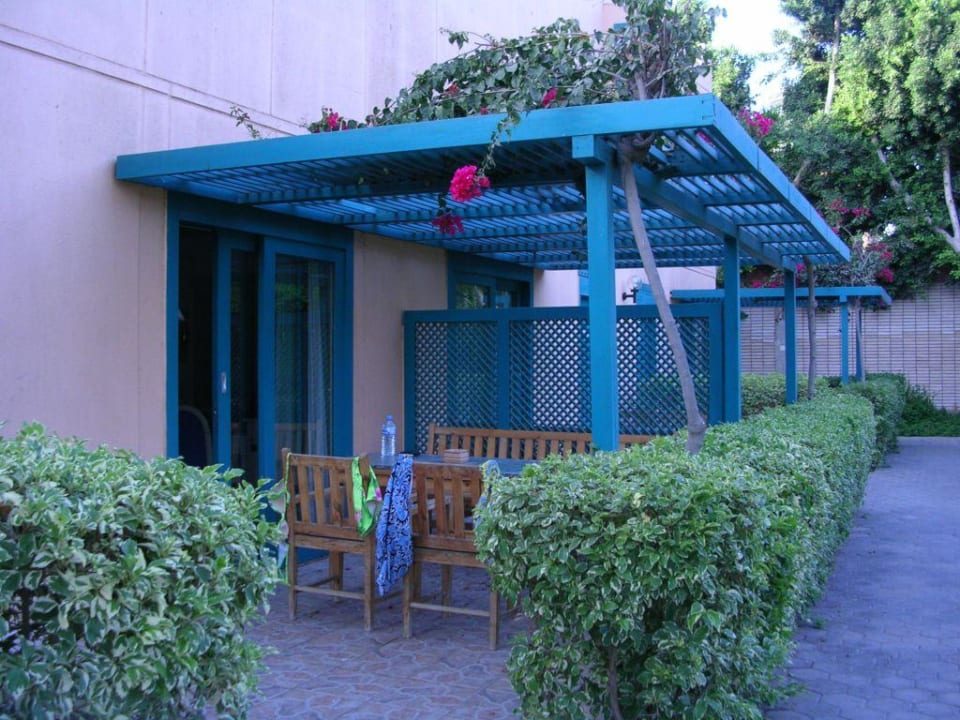 Vor jedem Bungalow gibt es einen schattigen Sitzplatz