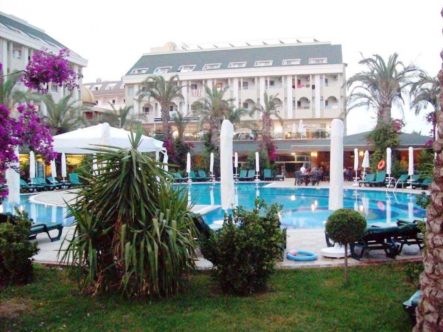 Blick vom Spielplatz aus über den Pool hinweg Richtung Poolbar, links daneben ist das Restaurant