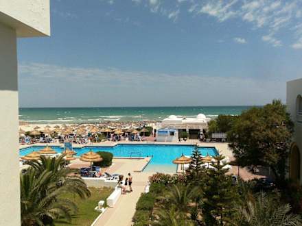 Blick vom Zimmer über den Pool zum Meer