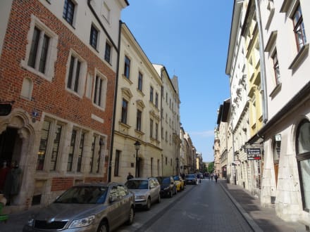 Links, das zweite Haus ist der Eingang. An der Laterne