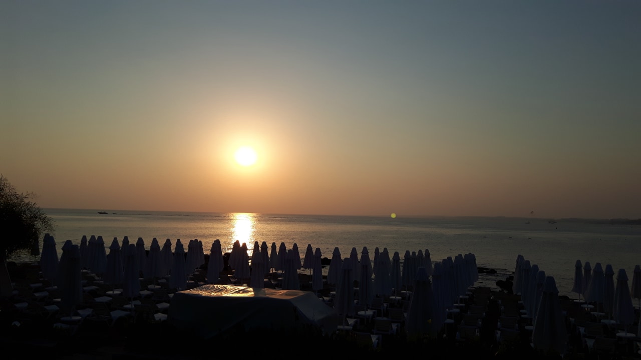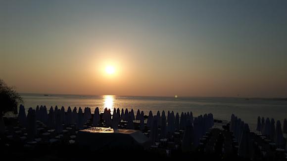 Von der Restaurant Aussen Terasse den Blick zum Meer und Strand