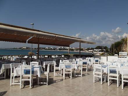 Blick auf die Terrassean einem 4er Tisch in der Mitte saßen wir, wenn die Tochter (4 J.) draußen sitzen wollte