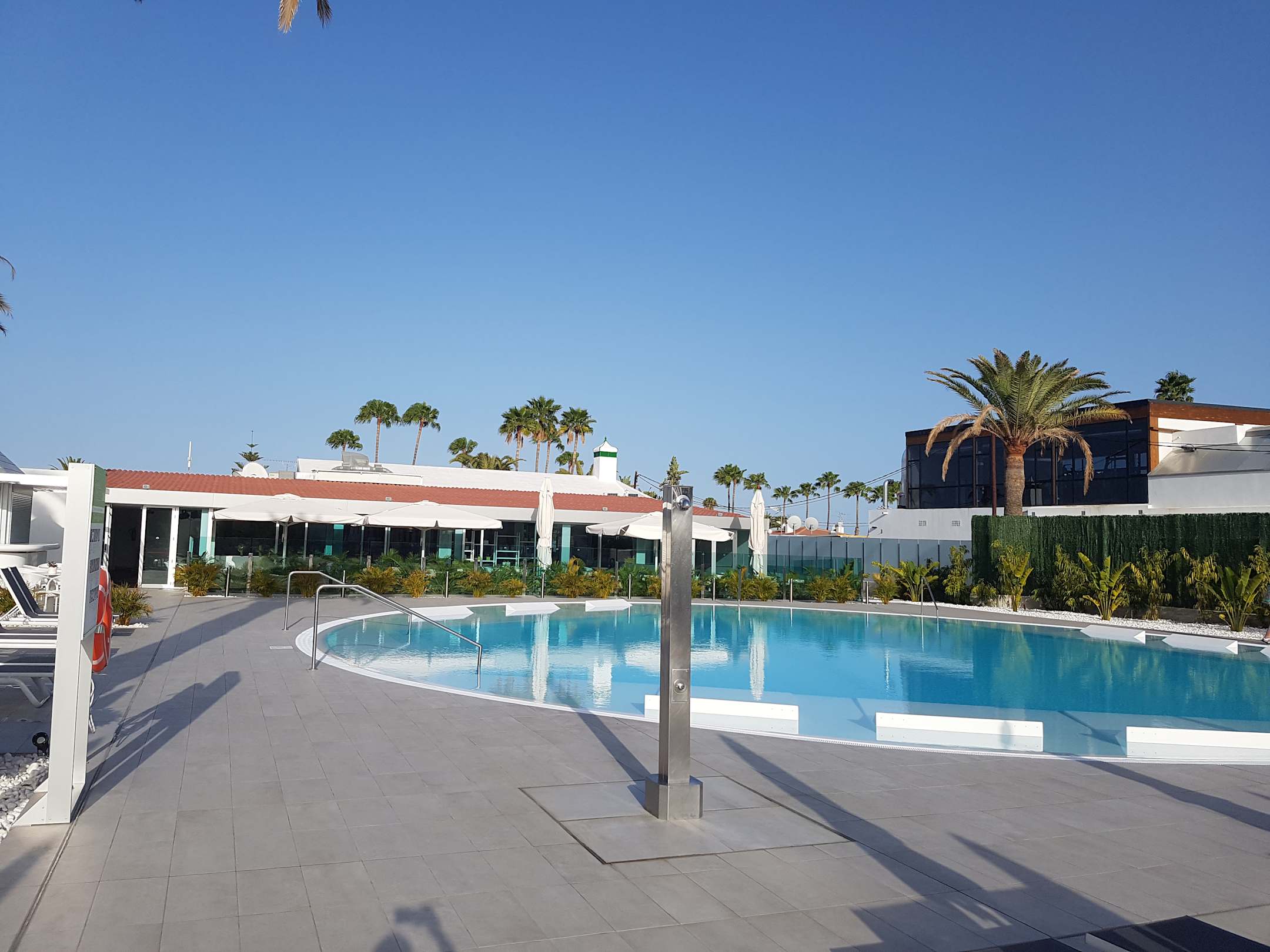 Pool rechts, Bar links, das Gebäude links hinter dem Pool ist das Restaurant auf dieser Seite