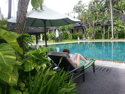 Blick vom Pool auf die Bungalows
