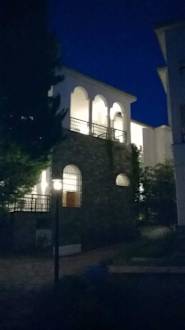Blick auf ein Nebengebäude abends