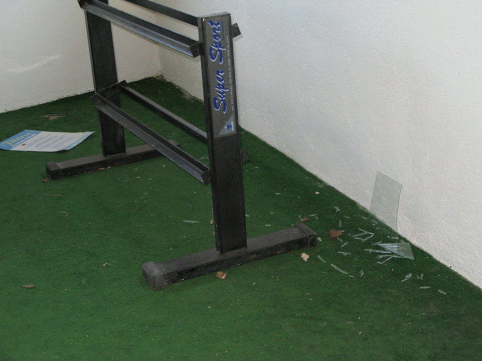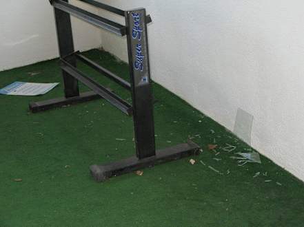 Fitnessraum in schlechtem ZustandGlasscherben von einer zerbrochenen Fensterscheibe, die keiner weggeräumt hat.