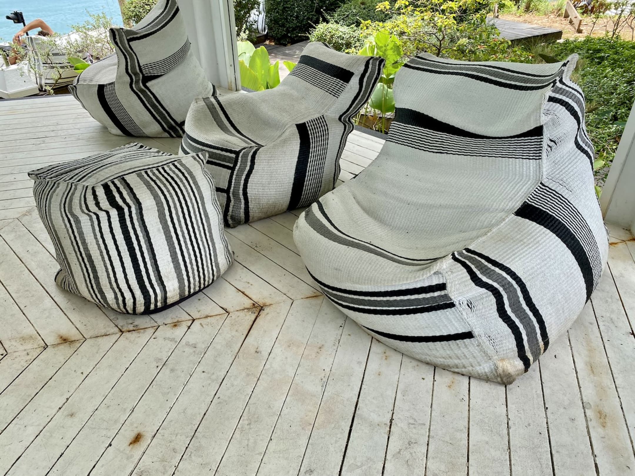 Teilweise vermoderte Sitzkissen beim Pool