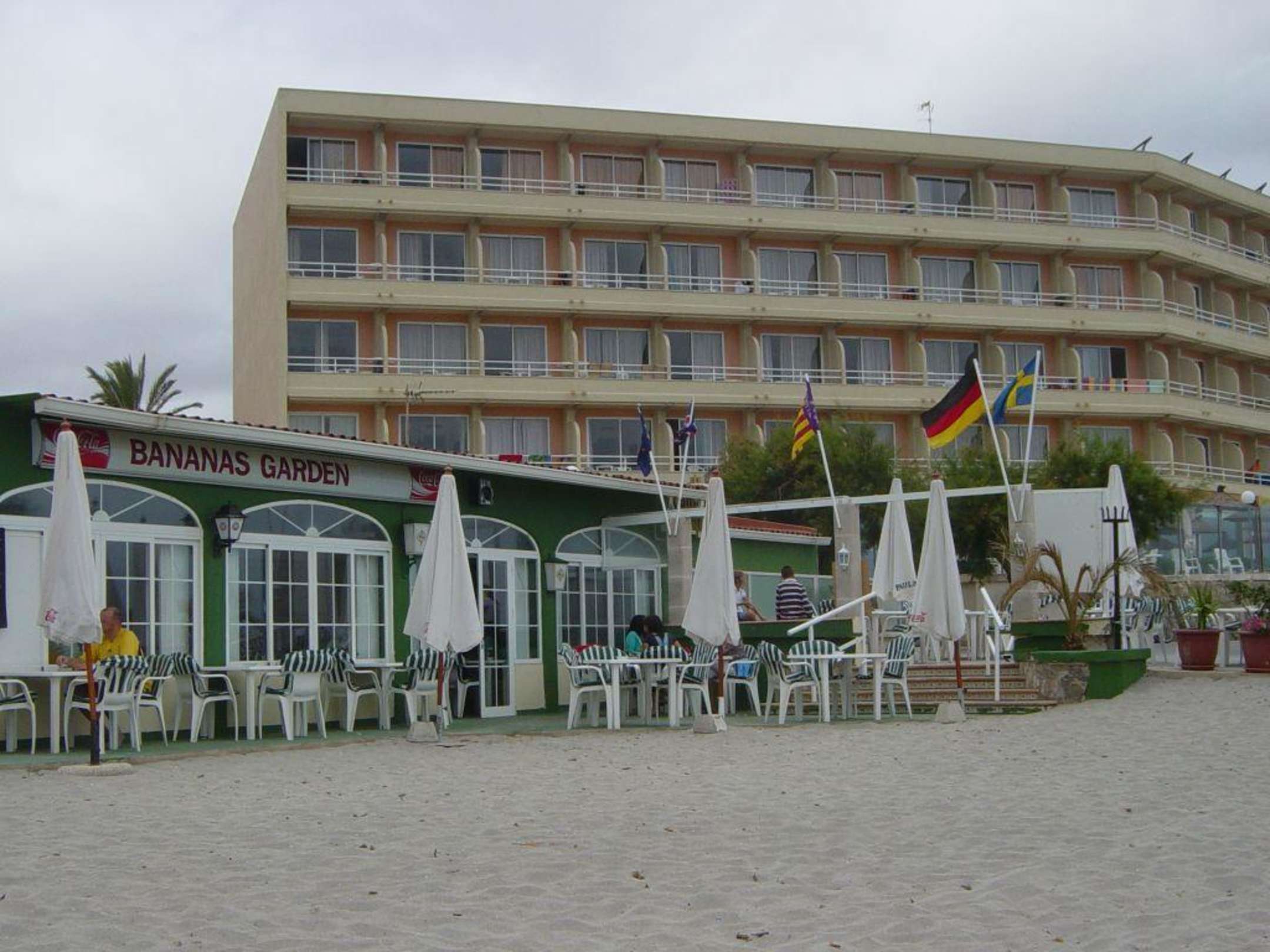 Außenansicht Hotel Concord in Can Picafort von der Strandseite fotografiert mit Strandbar im Vordergrund (gehört nicht zum Hotel)