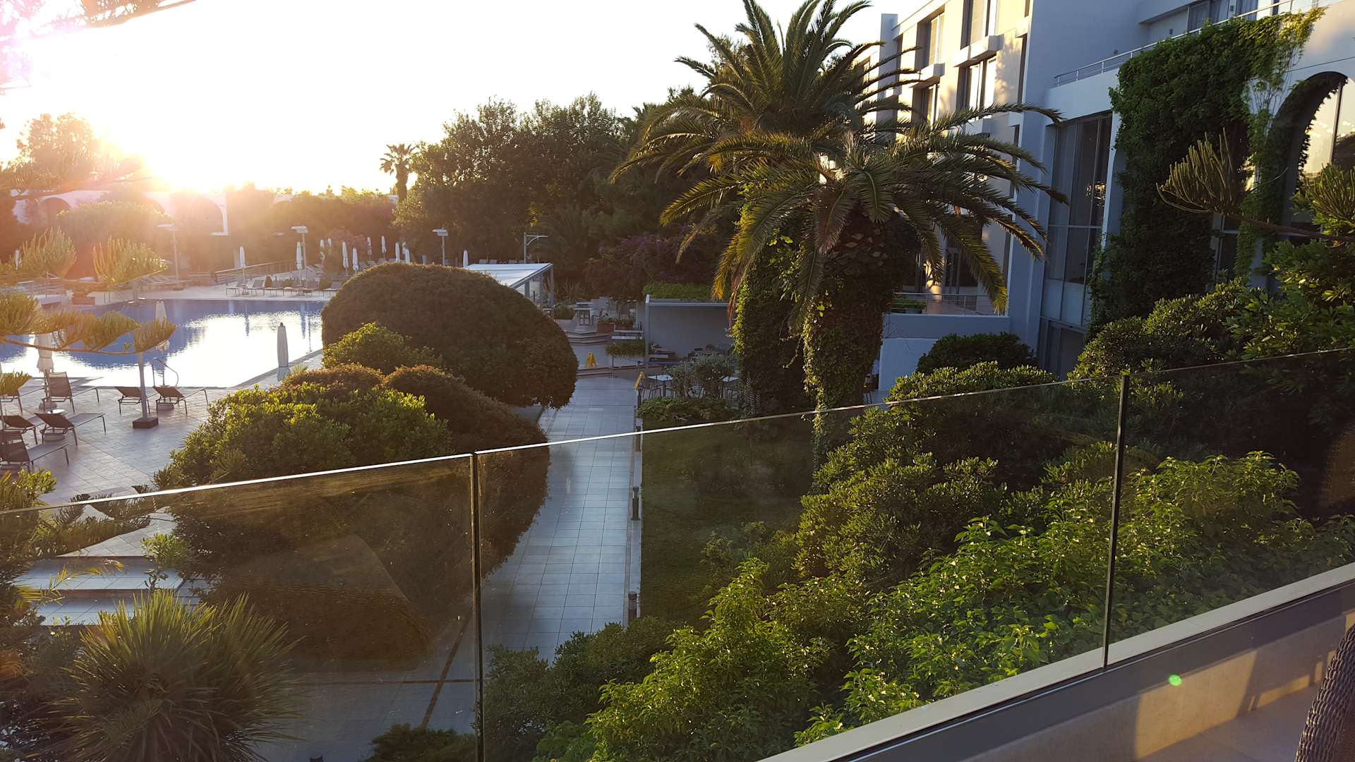 morgendlicher Blick vom Balkon an der Bar auf den Hauptpool (2017)