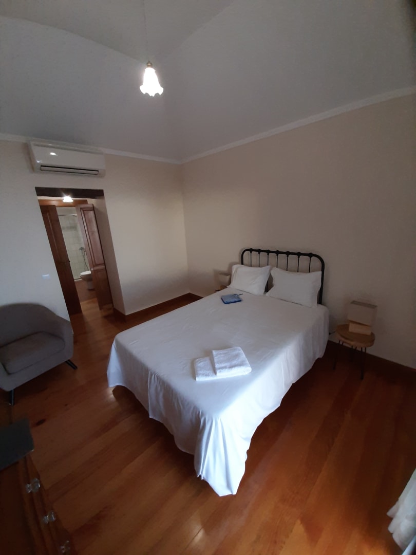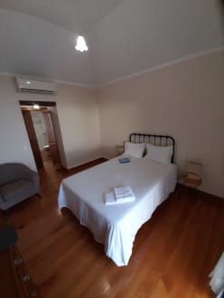 Schlafzimmer mit Nachttisch, Sessel und (nicht sichtbar) großer Kommode