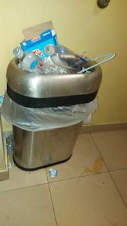 Überfüllter und nicht geleerter Mülleimer im Flur.