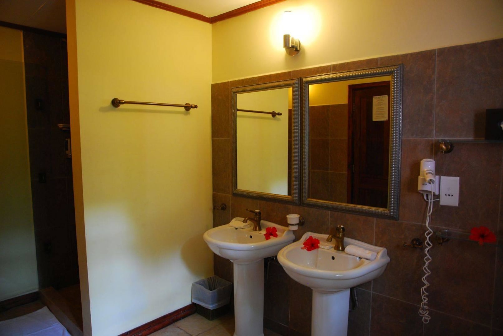 Das linke Waschbecken bildete nach Benutzung eine Pfütze auf dem Fußboden und war daher nicht nutzbar. Zu sehen ist außerdem die einzige Handtuchstange des ganzen Bades.