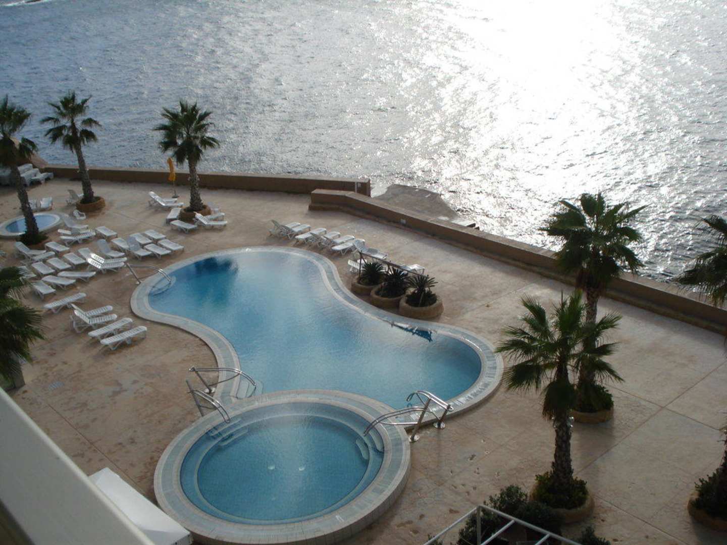 Vue de la piscine et de la mer.
